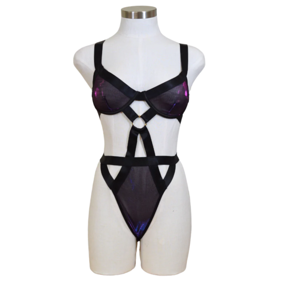 Add some sparkle to your lingerie wardrobe with this teddy! Featuring an underwire high-cut thong bodysuit with iridescent mesh and large ring details, this piece of lingerie demands attention! Unlined underwire cups and wide, adjustable shoulder straps for extra comfort and support.