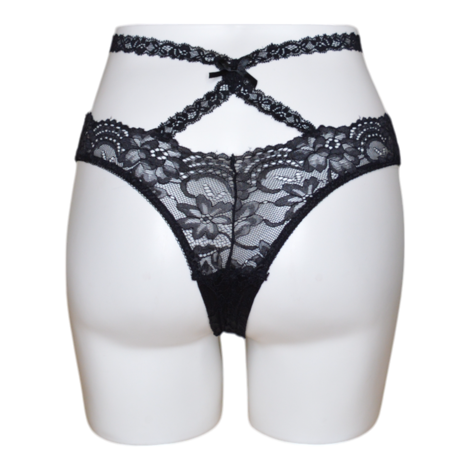 Make their jaws drop with the Oh My Lace Crotchless Panty from René Rofé. This confidence-boosting panty features a strapped design with hints of S&M and a cheeky low cut that accents and elongates your torso. The stretchable nylon lace form fits your curves while giving a peek at the skin underneath with a sensual, crotchless design.