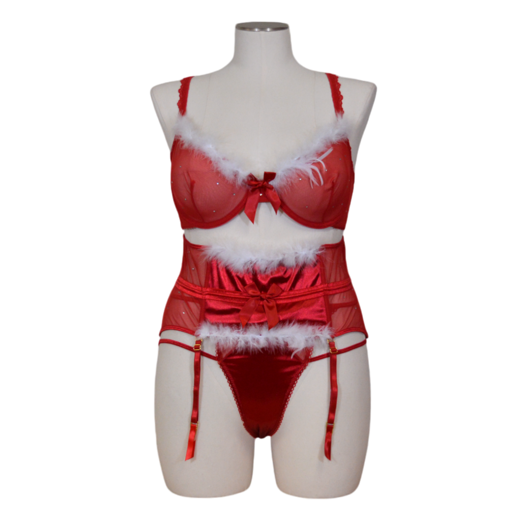 Holiday Sparkle Mesh Bra with Marabou Trim, Garter Belt & Panty. From Seven Til Midnight.