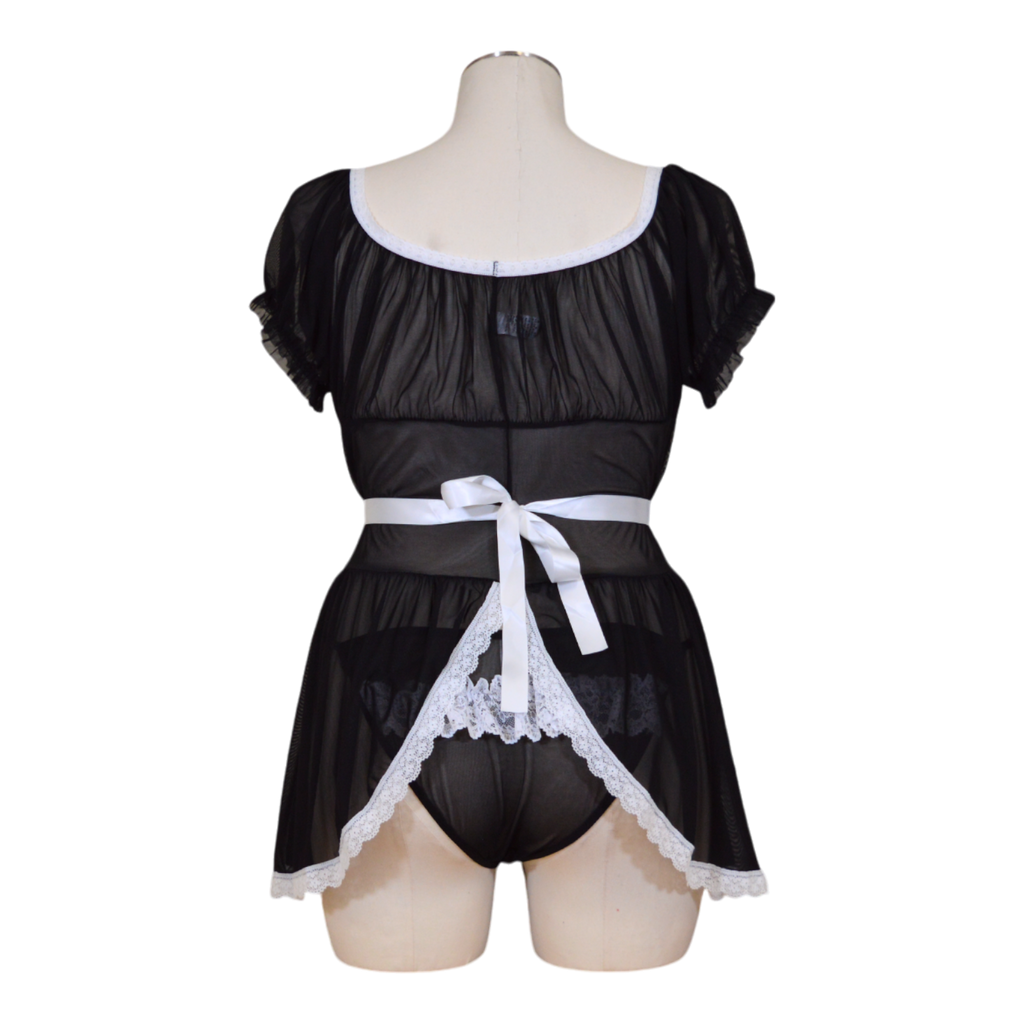 Off the Shoulder Black Mesh Babydoll Maid Costume- Comes with Maid Hat and Frilly Panties