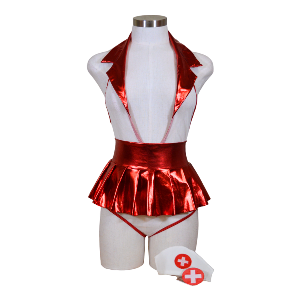 Show off your playful side with the ultimate nurse costume. This metallic and sheer fabric ensemble will have you feeling confident and sexy, with a cheeky hat and pasties this set is perfect for spicing up your love life or a fun costume party. Also available in curvy sizing