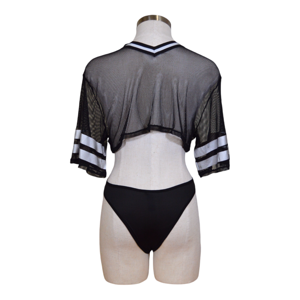 Score major points in the bedroom with this bundle. A mesh top and lace up panties provide sexy coverage. Perfect for a lingerie football game or steamy role play. Touchdown!