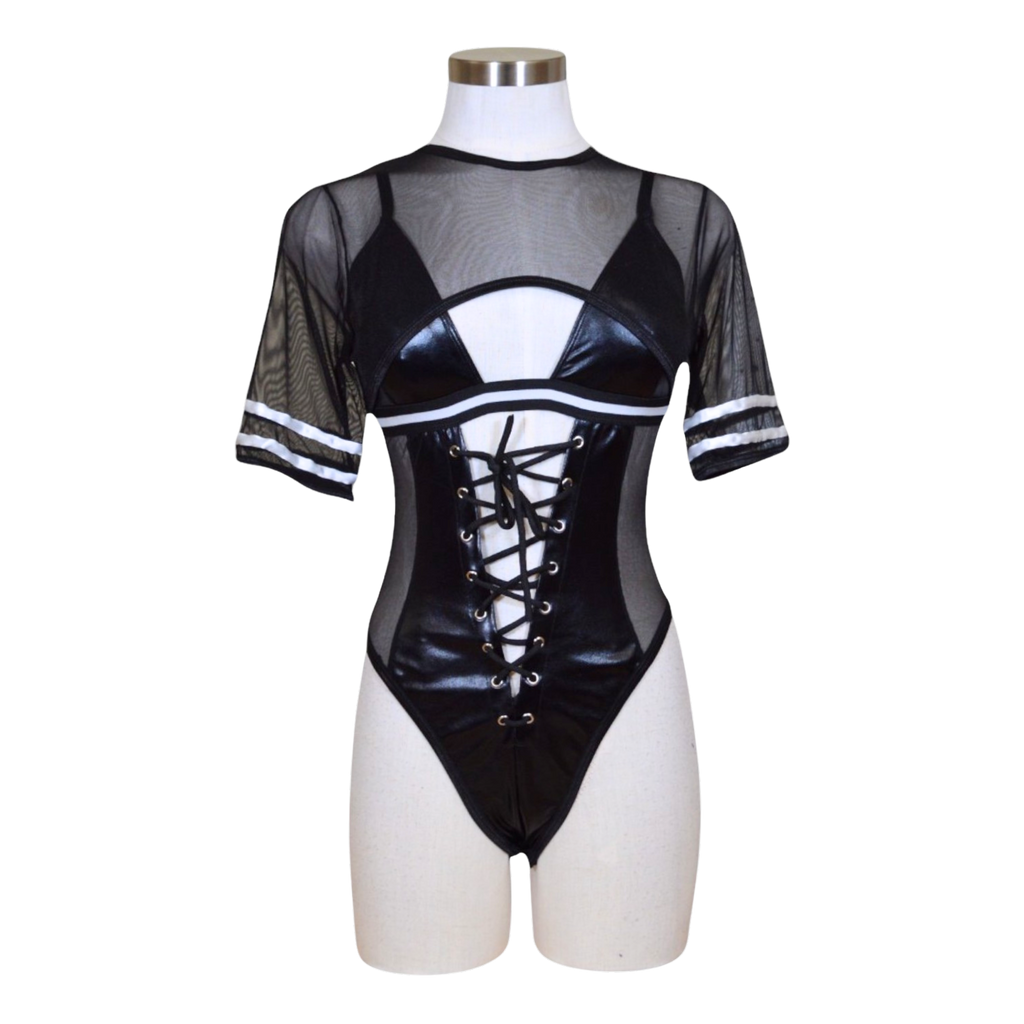 This black wetlook bodysuit with lace-up detail is sure to spice up any lingerie collection. The included mesh jersey shrug adds a touch of mystery and playfulness. Perfect for those who like to keep things interesting and leave a lasting impression. Also available in curvy sizing