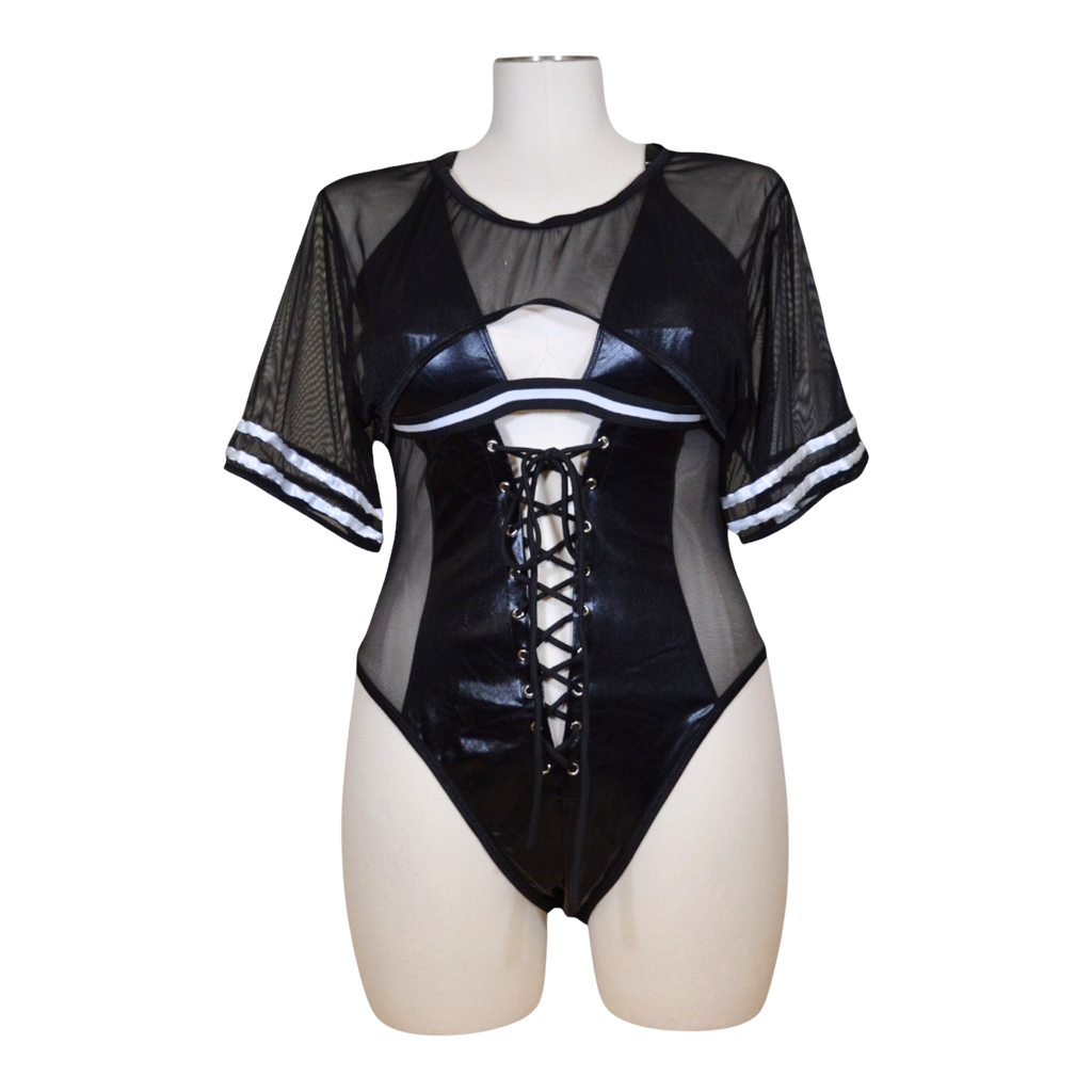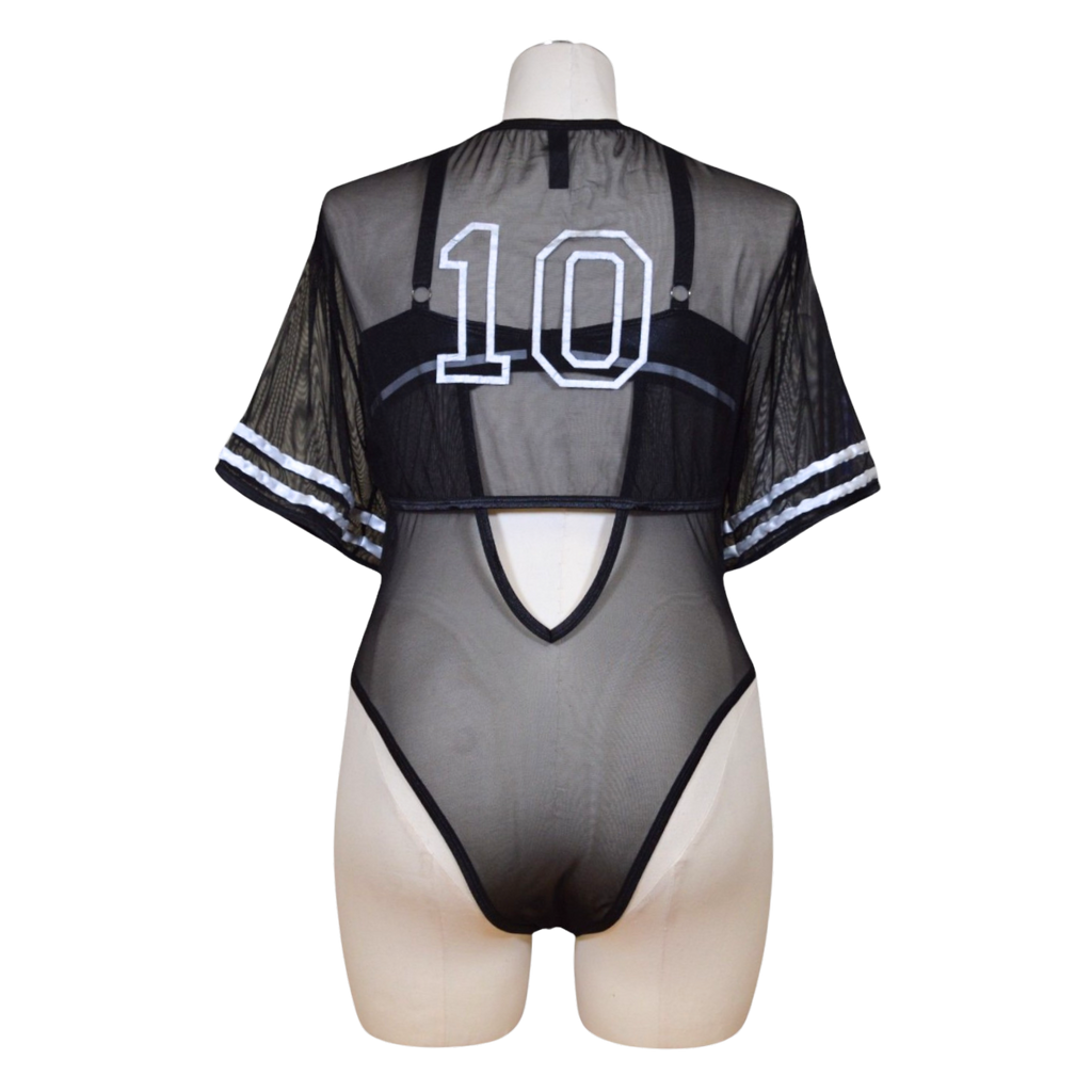 Indulge in a playful fantasy with this lingerie set. This soft stretch jersey set features a light blue and white striped design, adorned with delicate white lace for a touch of whimsy. Perfect for a costume or for a cheeky night in! Also available in smaller sizing.
