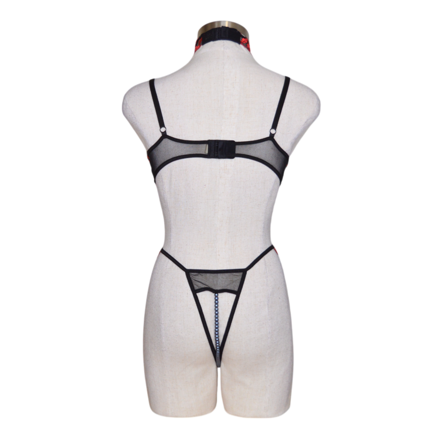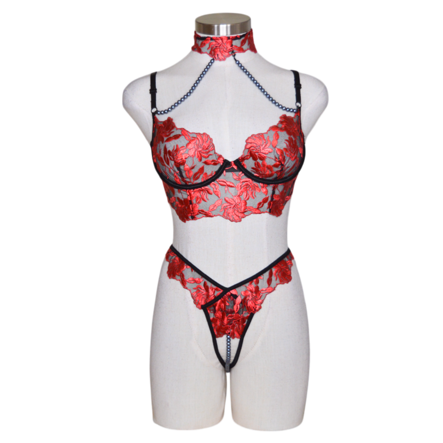 Turn up the heat in this fiery red lingerie set that's anything but subtle! The vibrant floral embroidered bra creates a stunning silhouette, while the removable pearl choker adds just the right touch of elegance with attitude. The matching crotchless pearl panty delivers an unexpected surprise that's both playful and provocative. Perfect for when you want to make an unforgettable impression and feel absolutely fabulous from every angle!