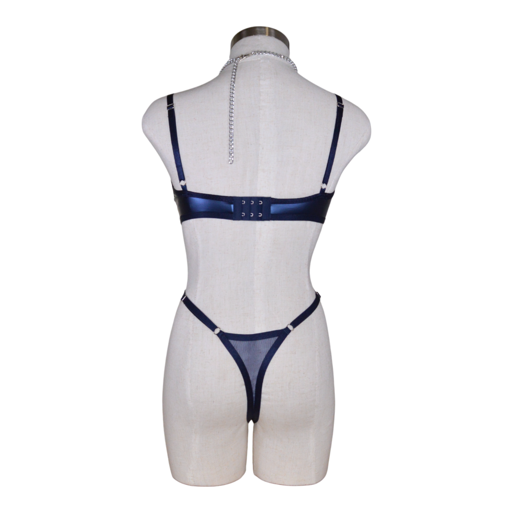 Soft lace cup with underwire. Wet look under bust detailing. Ring details.Thong cutout detail. Adjustable bra straps. Adjustable thong straps. Silver tone hardware. Removable and adjustable chain detailing.