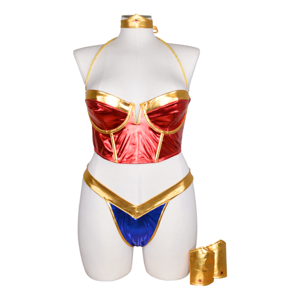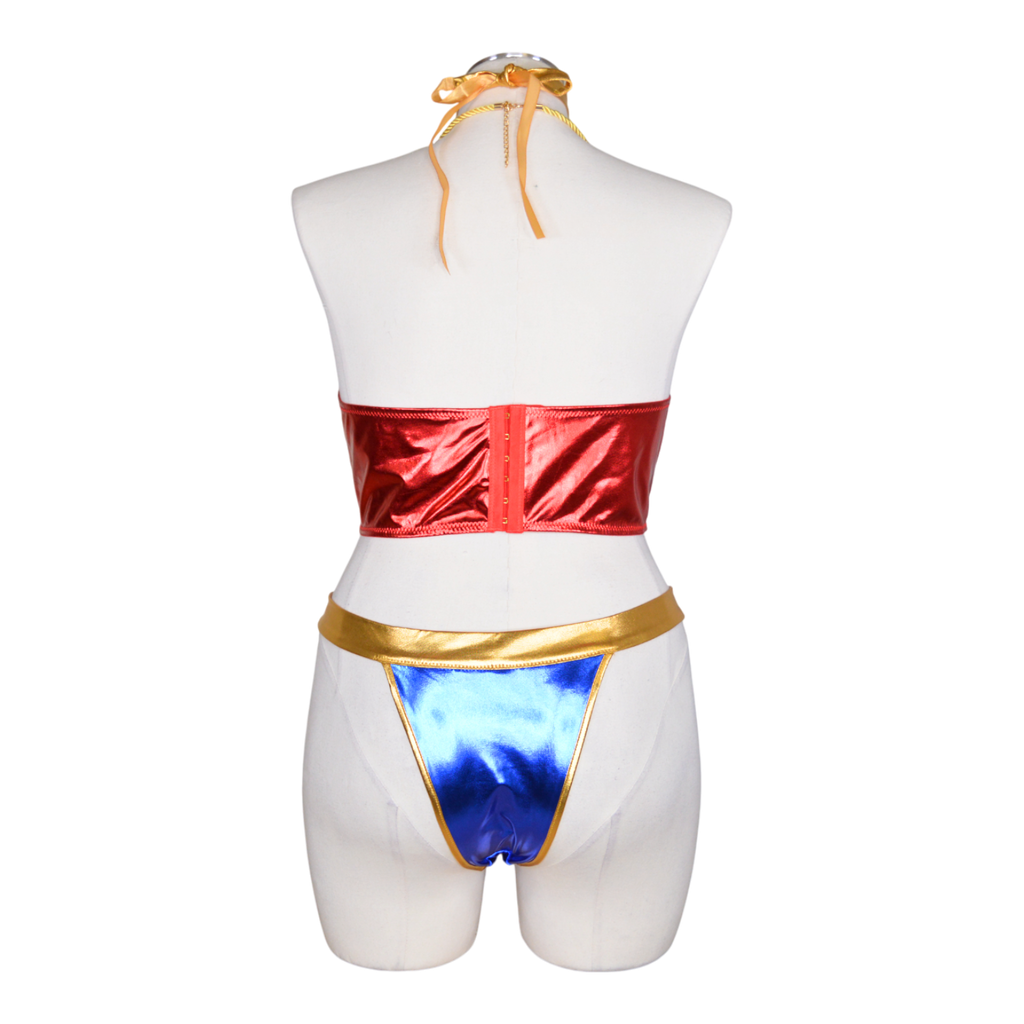 Metallic bustier top with detachable rope halter, panty, wrist cuffs and headband.Features: