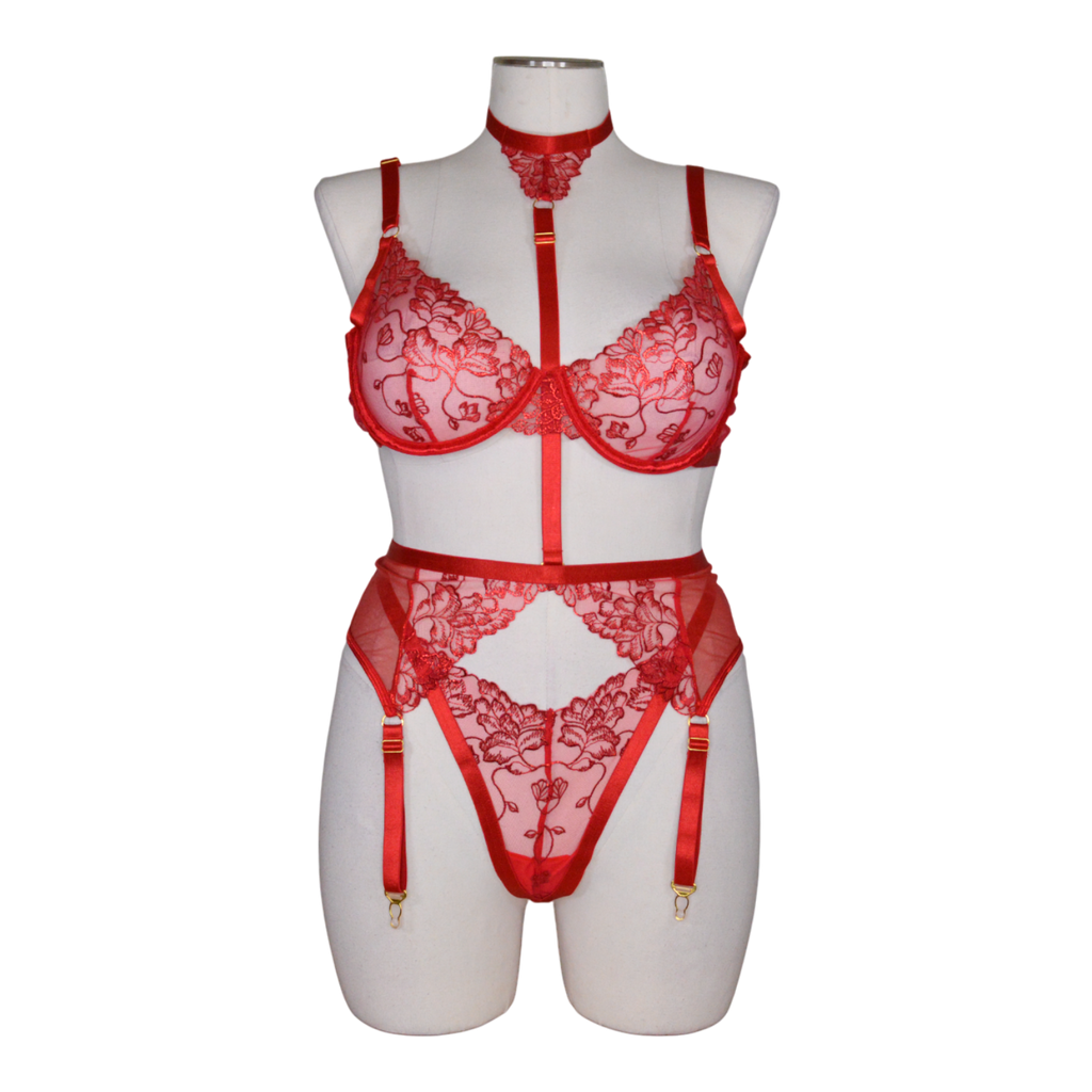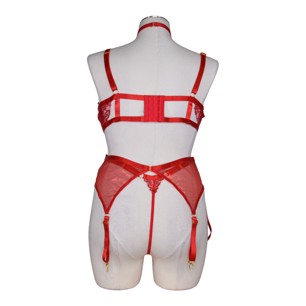 Bra, garter belt with detachable collar harness strap, and g-string in shimmer lace and mesh.