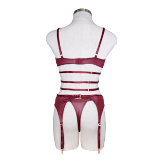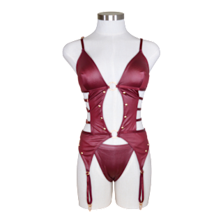 Command attention with the Lust Kira basque set from the Lust Fetish collection. This lingerie piece is crafted from a sleek, shiny stretch fabric that molds to the body, featuring an open-front design with bold nickel-plated metal studs and rings for an edgy, fetish-inspired look. Adjustable straps and attached leg garters allow for a customizable fit, while the matching classic thong completes the set. Designed for those who love to make a statement, this set is the perfect addition to any daring lingerie collection.