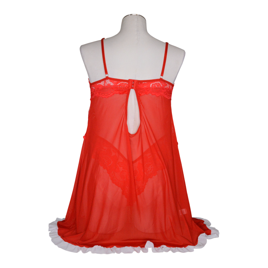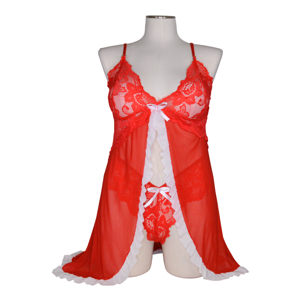 Bring the heat this Valentine's season with this irresistible red baby doll that screams fun and flirtation. White trim perfectly frames the design, while lace accents on the cups and panty add a touch of tempting elegance. The open silhouette is designed to turn heads and ignite sparks. Also available in smaller sizes.