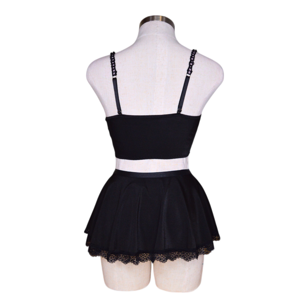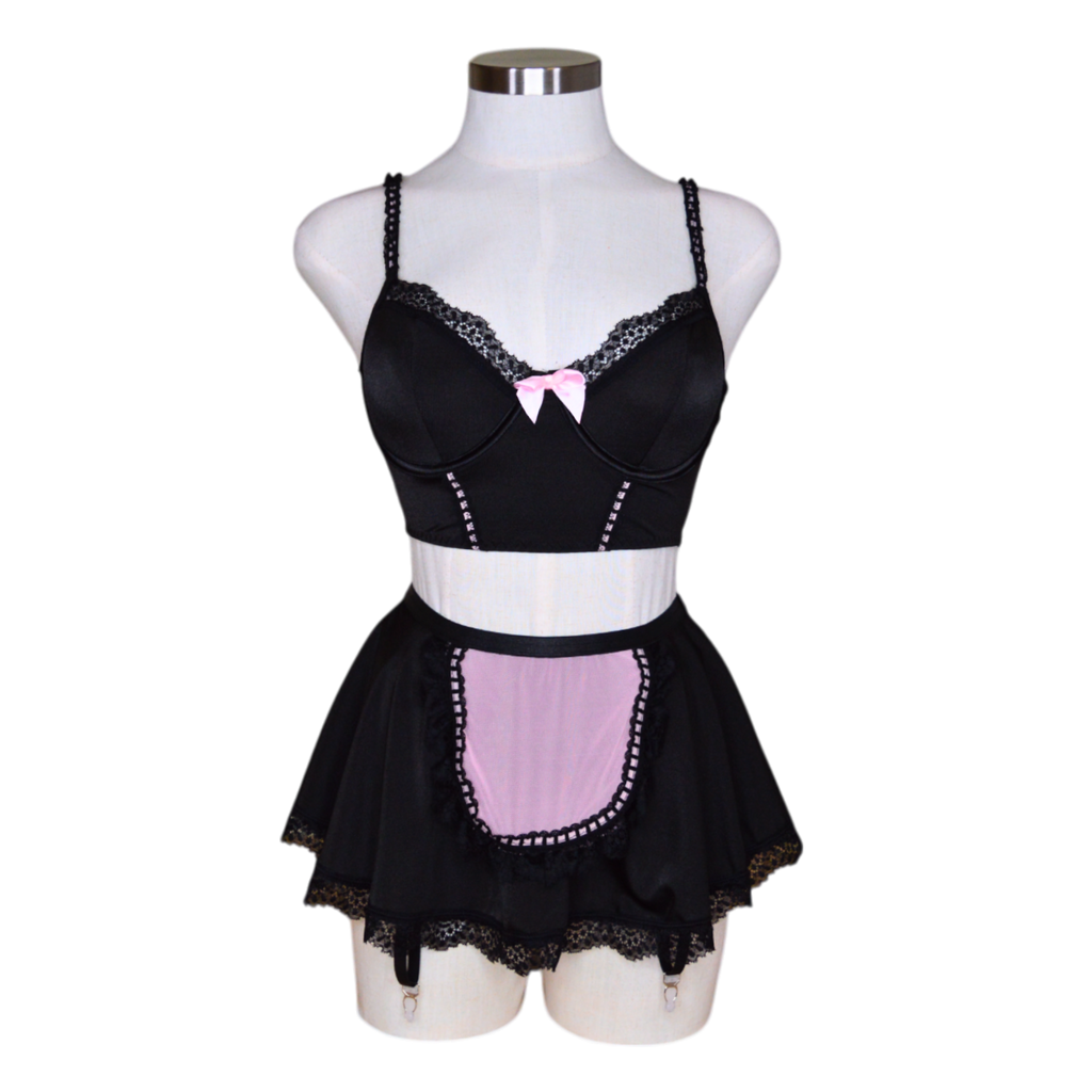 Get ready to spice up your Valentine's Day with this lingerie set. The black and pink skirt features garter straps for a seductive touch, and the top has underwire for support. The delicate lace adds a touch of romance to this playful piece. Perfect for a flirty and fun night in. Also available in curvy sizes.