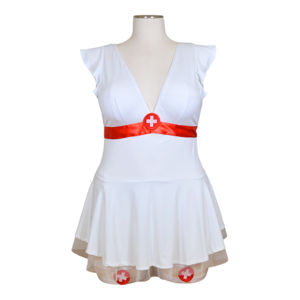 Bedside Nurse 3 Piece Set from Fantasy Lingerie. It's not a fever. It's just your temperature rising in anticipation of your visit from the Bedside Nurse! She has got a tie back short sleeve dress with faux stocking garters, matching high cut panties and medic hat to cure what ails you. Features: 3 piece set. Breathable microfiber. Detachable garters. Includes matching panties. Color White, Red. Fabric content 90% Polyester, 10% Spandex. Washing instructions: hand wash separately in cold water. Do not bleach. Flat dry.
