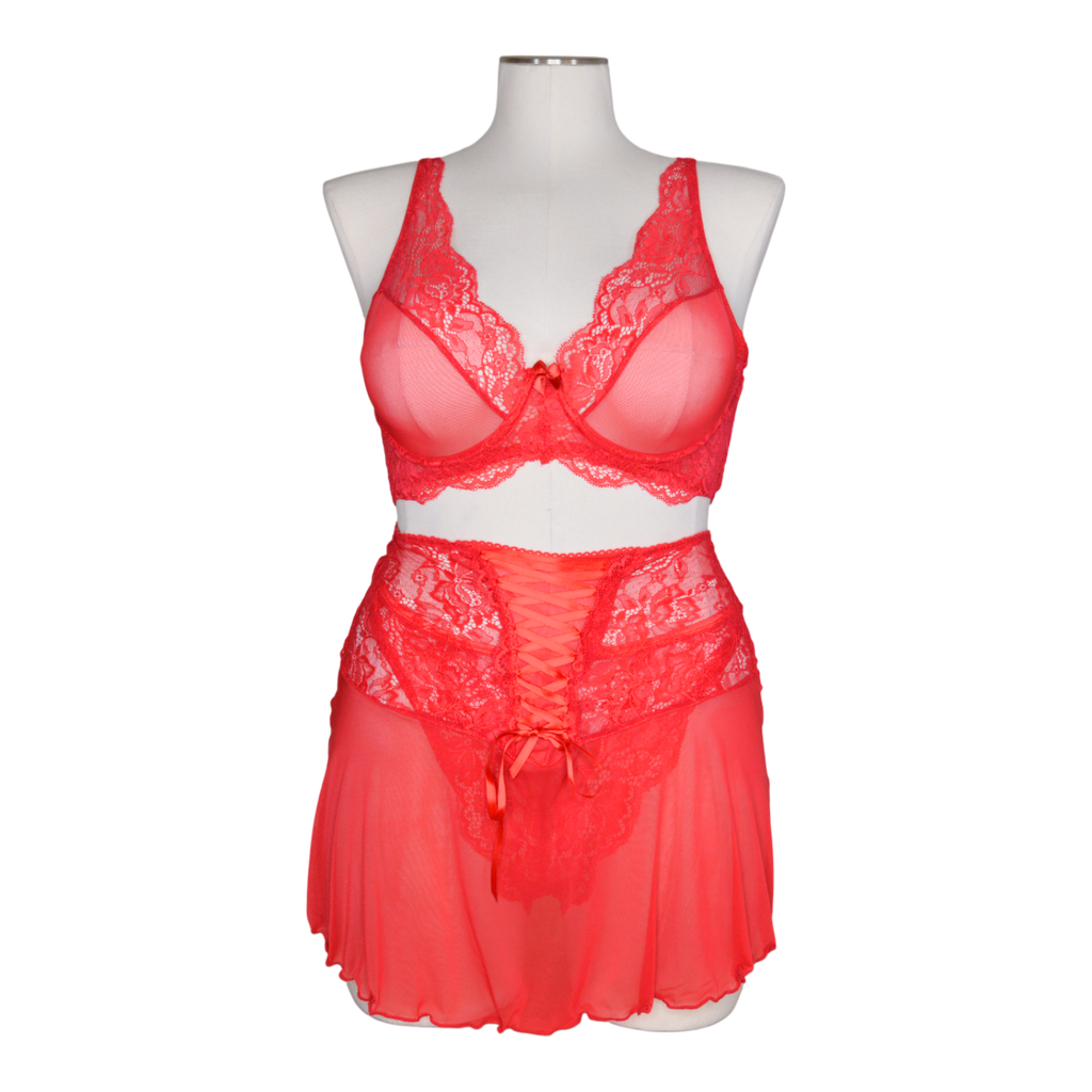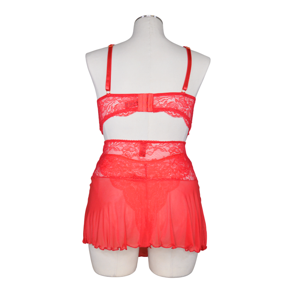 From the Sugar High collection by Magic Silk, this style includes: a sheer mesh and lace bralette with underwire, satin bow, hook and eye closure and adjustable gold sliders, sheer mesh and lace cinch skirt with satin tie and thong.