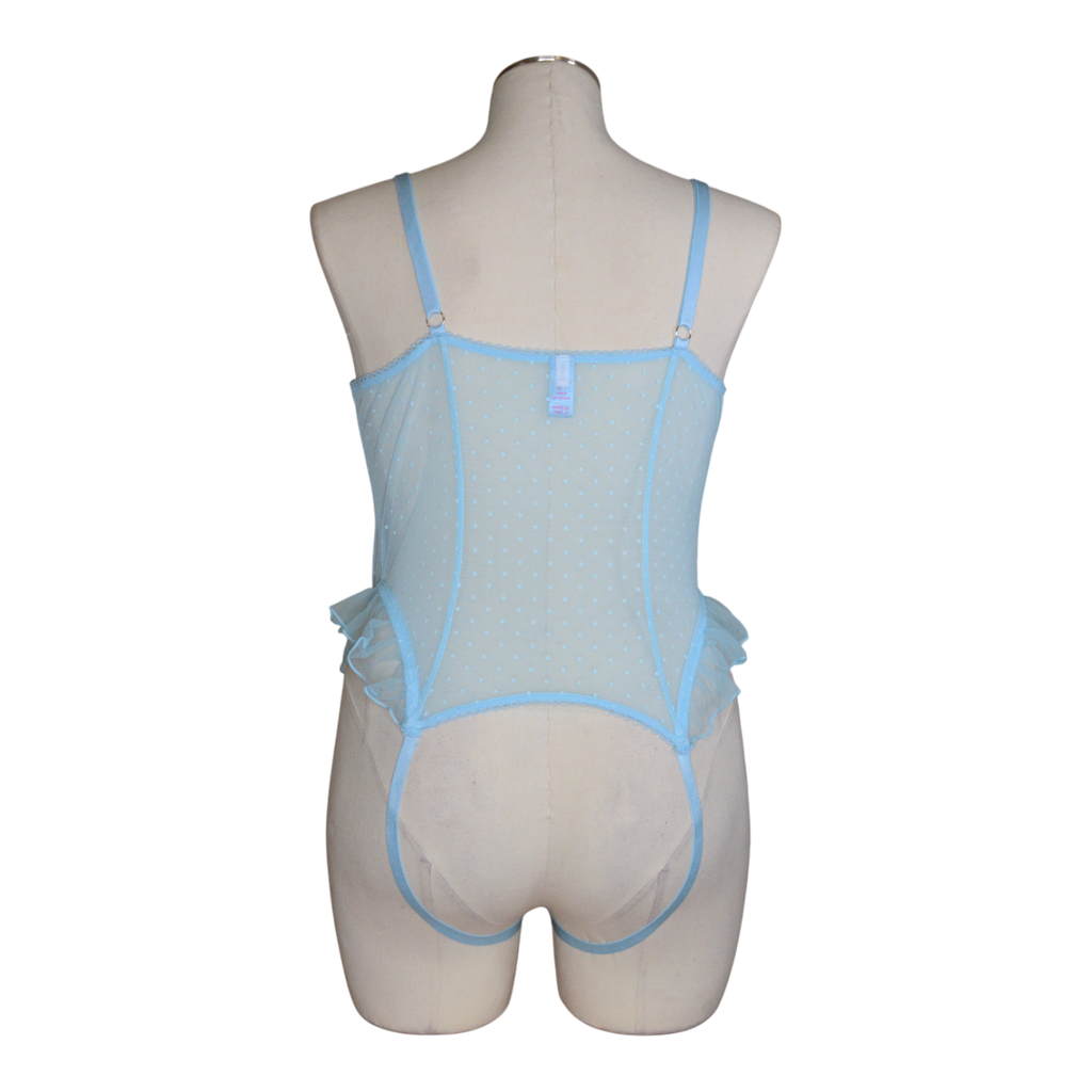 Bring romance and playfulness to your store with the Blue Sky Ruffled Crotchless Playsuit, a stunning baby blue crotchless teddy designed to captivate. Crafted from soft, stretchy flocked polka dot d’esprit mesh and delicate floral lace, this piece features scalloped lace cups with underwire support, adjustable shoulder straps with silver-tone sliders, and flirty ruffles at the hips. A satin bow detail adds a sweet finish, while the open crotch design enhances its allure.