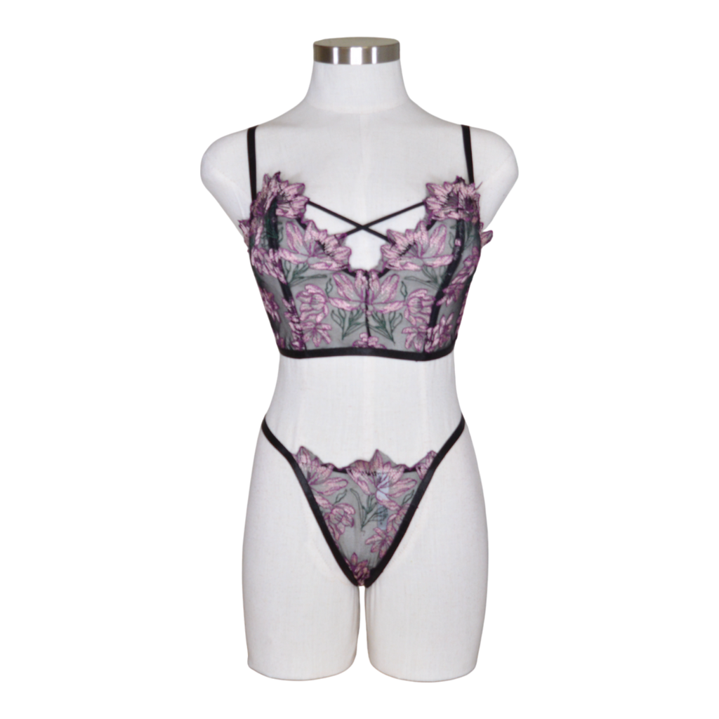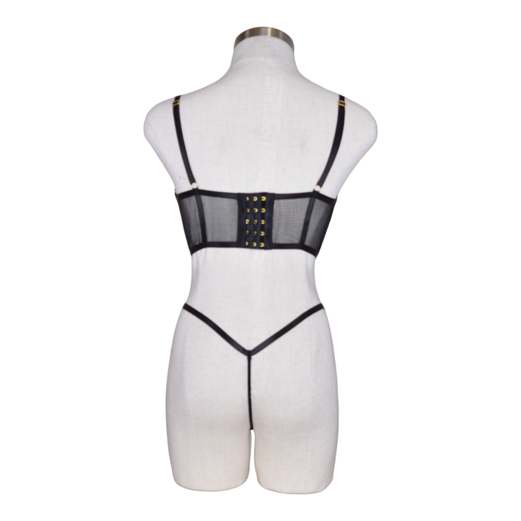 Romantic yet undeniably bold, the Adela Floral Bustier Set brings structured drama to your lingerie drawer. Crafted from sheer mesh and embroidered with delicate floral motifs, this boned bustier shapes and supports while revealing just enough. Adjustable shoulder straps and a curve-hugging fit keep the silhouette sleek and seductive. Finished with a matching G-string for a cheeky touch, Adela is made to be seen — and remembered.