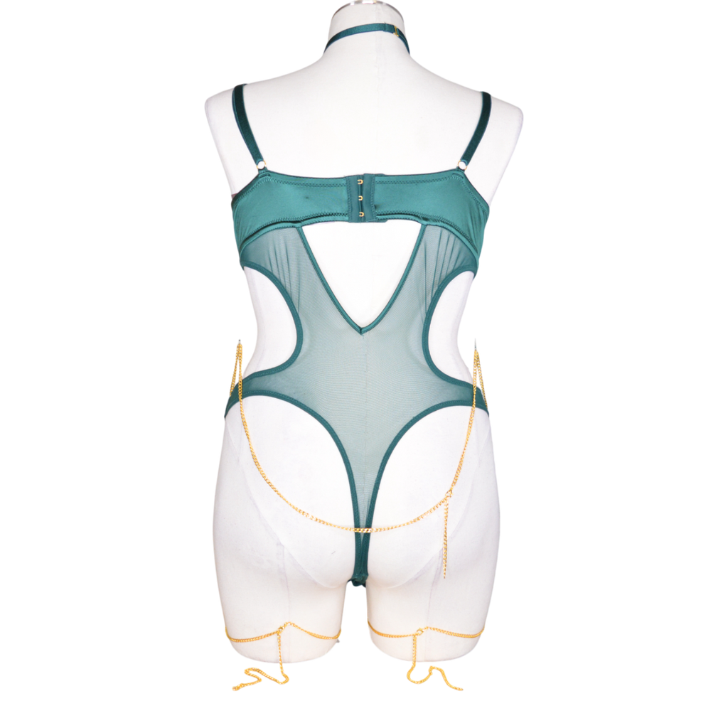 A dangerously sexy one piece, the Evangeline Satin & Chain Halter Teddy elevates the allure with its dreamy fabric and luxe accents. Sleek liquid satin and mesh envelops your figure while gilded chains wrap across the skin, highlighting the bust, waist, and thighs. Adjustable chains customize to your body for a fit that flatters every figure.