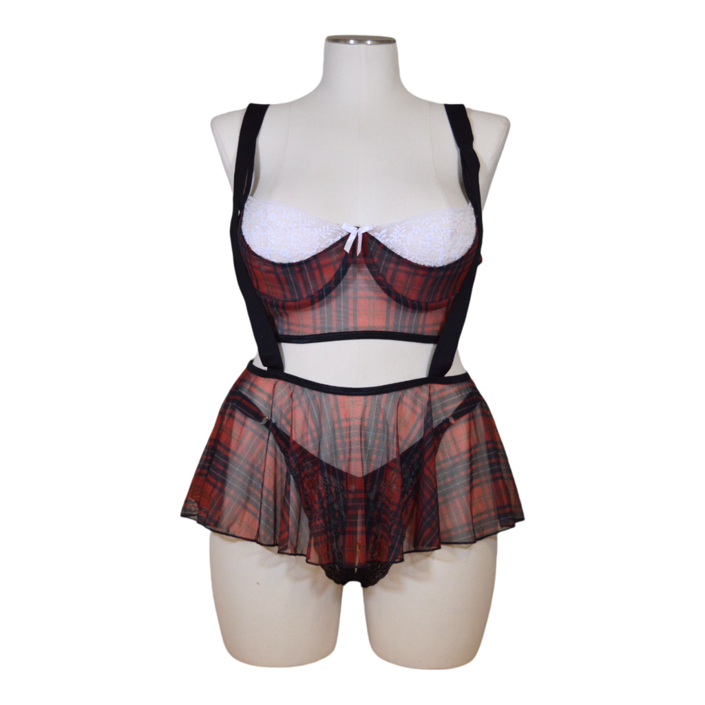 Transform into a sexy school girl with this 3 piece set! Includes suspenders with a playful plaid skirt in mesh. Perfect for spicing up the bedroom or adding some fun to your lingerie collection. Be bold and playful in this set! Also available in smaller sizing.