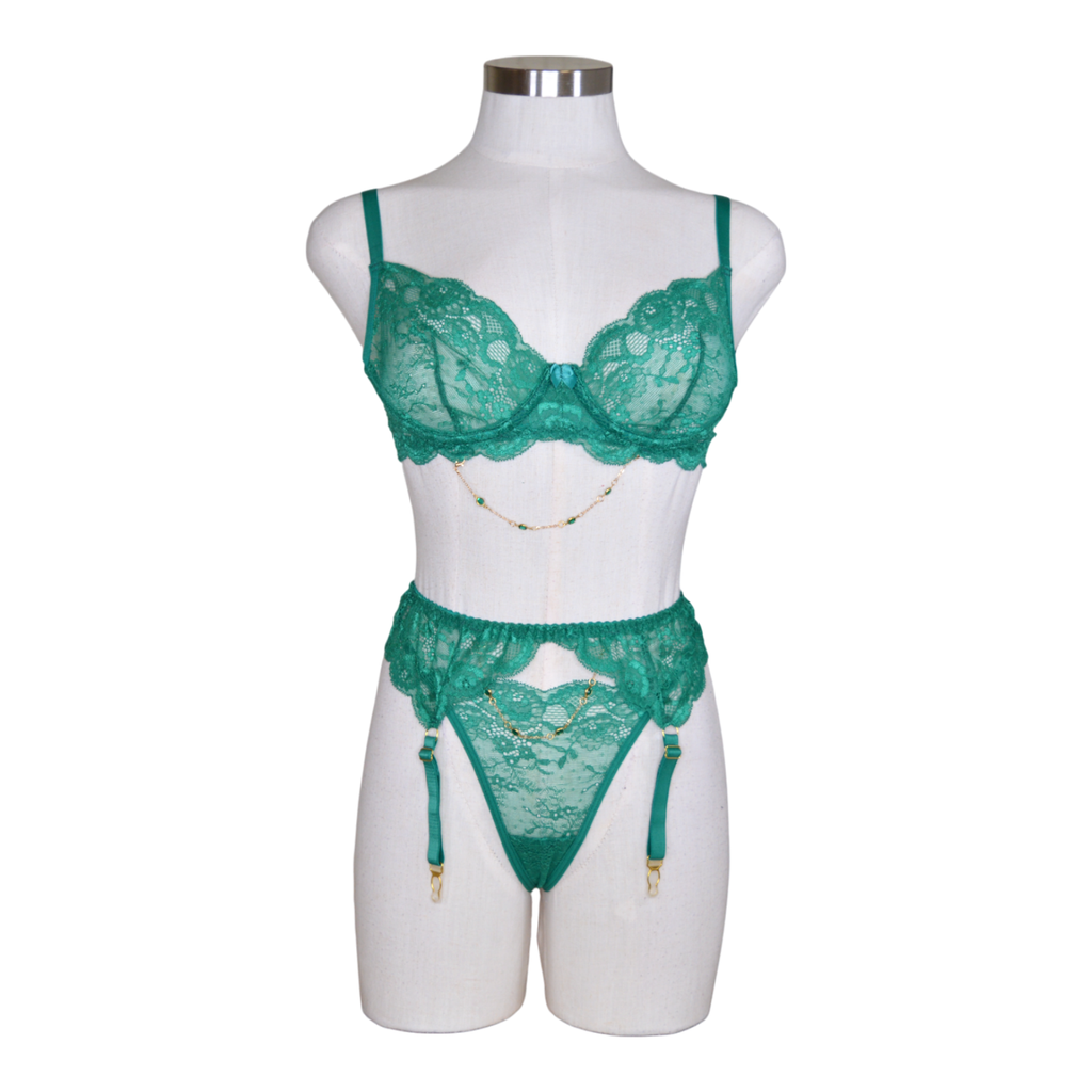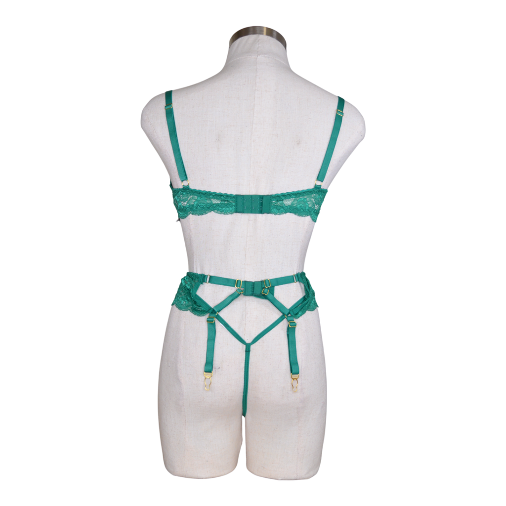 Sultry Emerald Floral Lace Underwire Bra w/Garterbelt & G-String 3 pc Set
