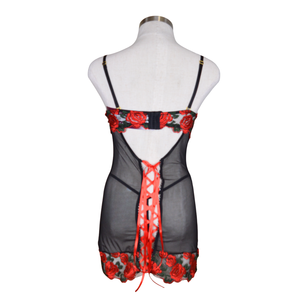 A statement piece with timeless appeal. This underwire babydoll features delicate rose embroidery contrasted with sheer mesh and a sensual full lace-up back. Includes a matching panty and removable straps for versatile styling.