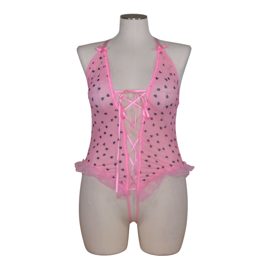 Slip into romance this Valentine's Day with our adorable open bottom teddy! Soft pink fabric is dotted with delicate black hearts, while a playful crossed back design adds an extra touch of allure. The front laces up with a pretty pink ribbon, letting you control the fit and tease with every adjustment. Perfect for date night or a cozy night in—this flirty piece celebrates love with style and sass.