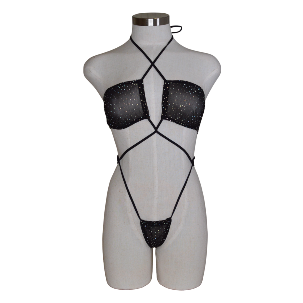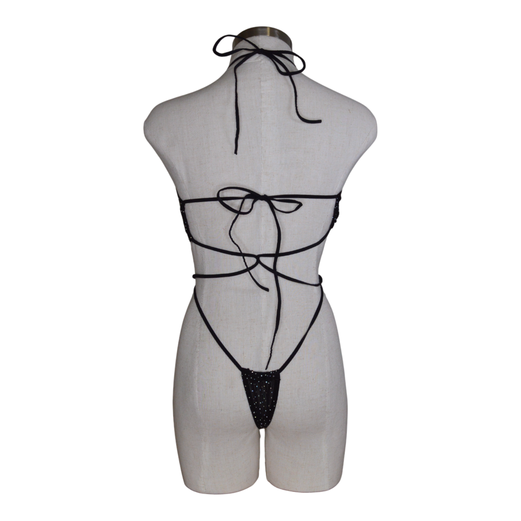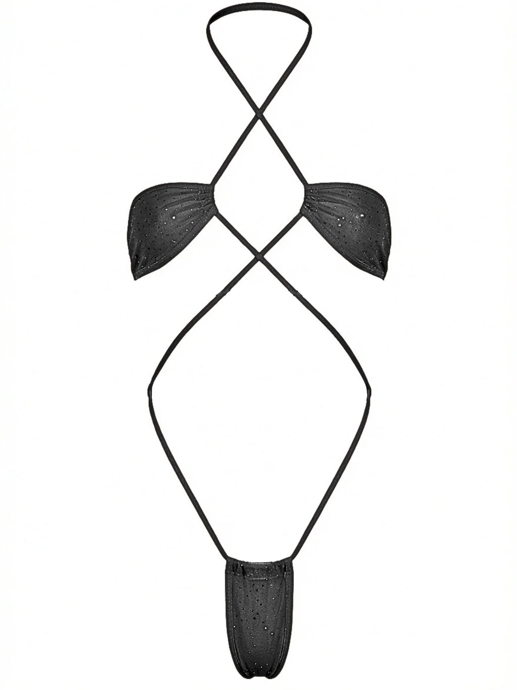 Tempt and tease in this daring rhinestone bikini bodysuit by Leg Avenue. The strappy wrap-around detail and jaw-dropping micro-bikini design are sure to leave them wanting more. Whether you're heating things up in the bedroom or making waves poolside, this sexy lingerie promises to captivate.