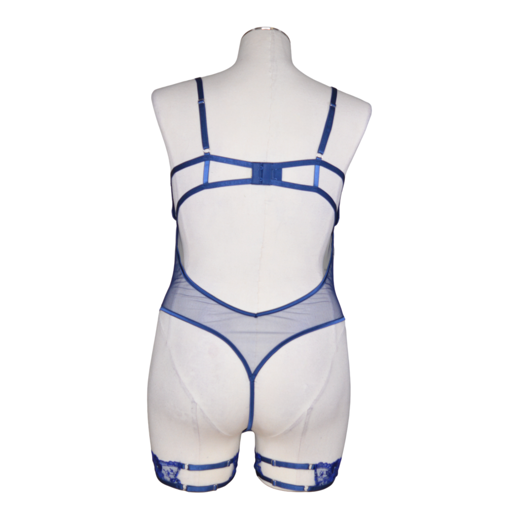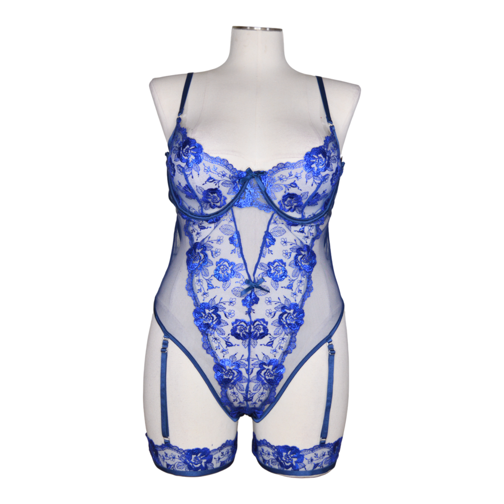 Garden Of Eden Garter Teddy. Metallic embroidery floral lace. Satin ribbon bow detail. Demi cup with underwire. Hook & eye closure. Adjustable leg garters. Thong back. Cotton Gusset.