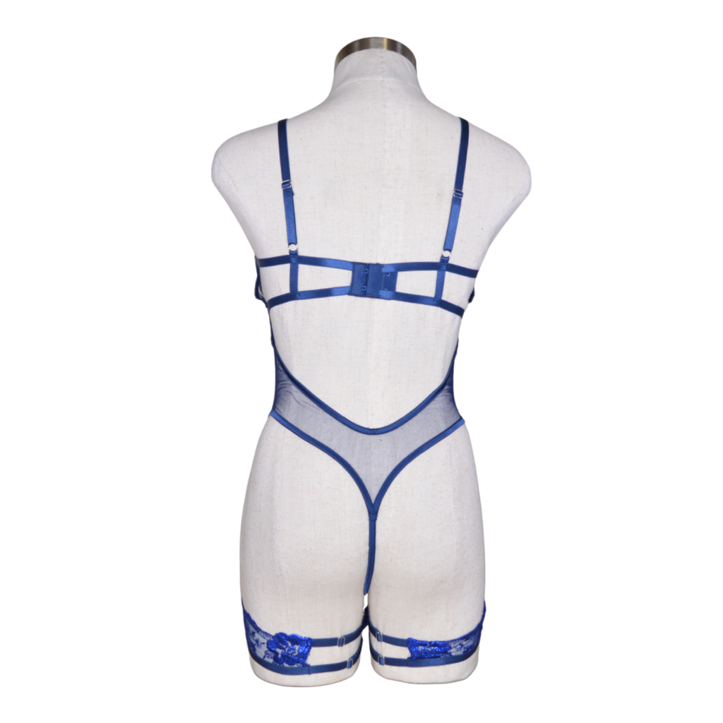 Garden Of Eden Garter Teddy. Metallic embroidery floral lace. Satin ribbon bow detail. Demi cup with underwire. Hook & eye closure. Adjustable leg garters. Thong back. Cotton Gusset.