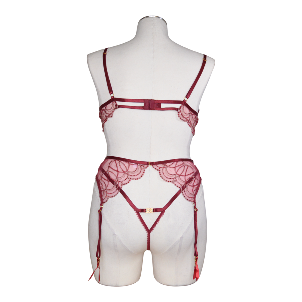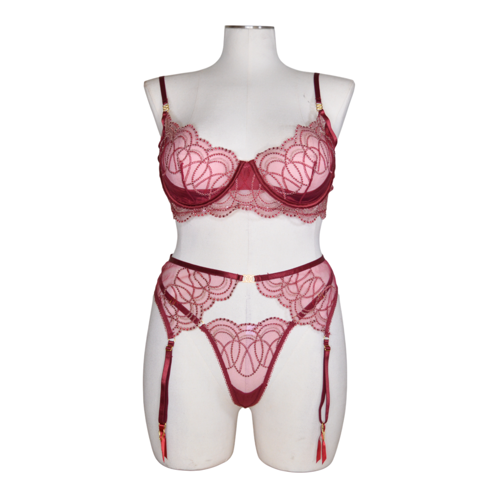 Beaded Belle 3-Piece Garter Set. Metallic embroidery bead lace. Three ring metal hardware. Demi cup with underwire.