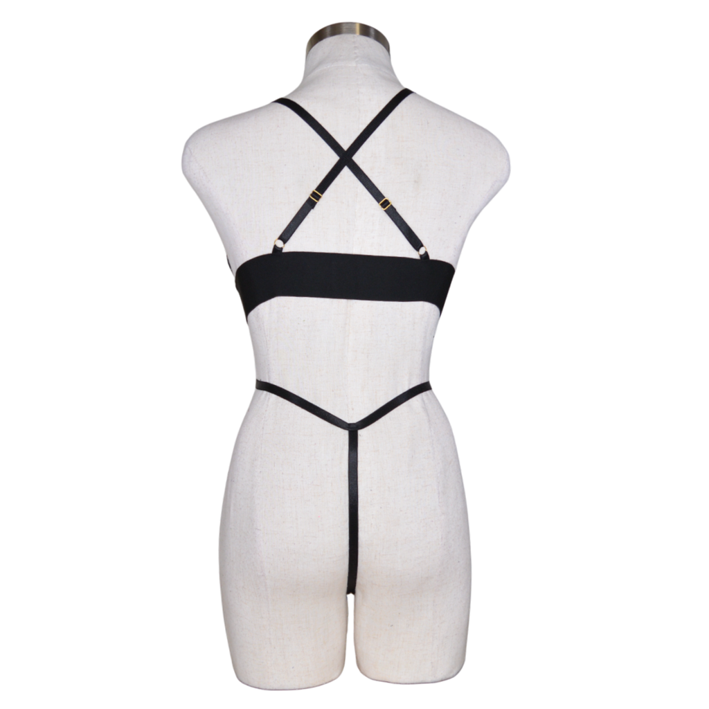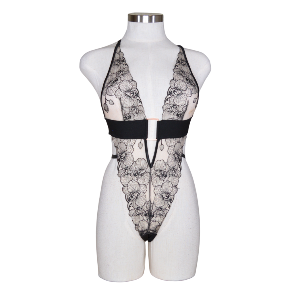 Orchid Blossom Teddy. Embroidered orchid detail on illusion tulle. Plunging neckline.Oversized hardware detail. Single string thong back. Cotton gusset.