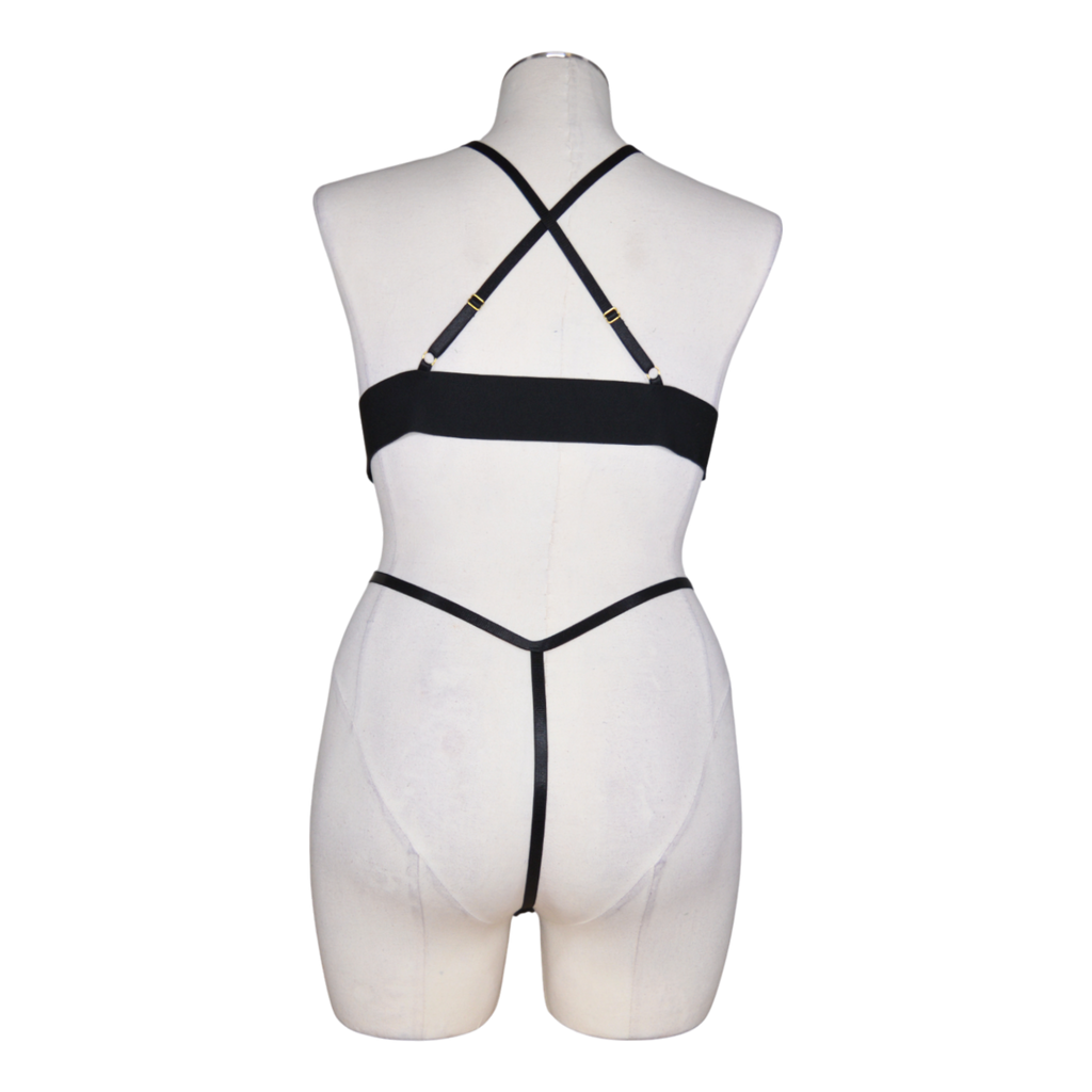 Orchid Blossom Teddy. Embroidered orchid detail on illusion tulle. Plunging neckline.Oversized hardware detail. Single string thong back. Cotton gusset.