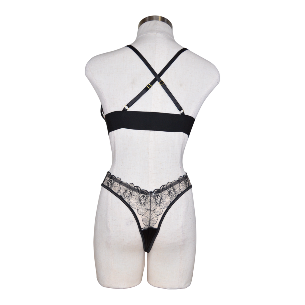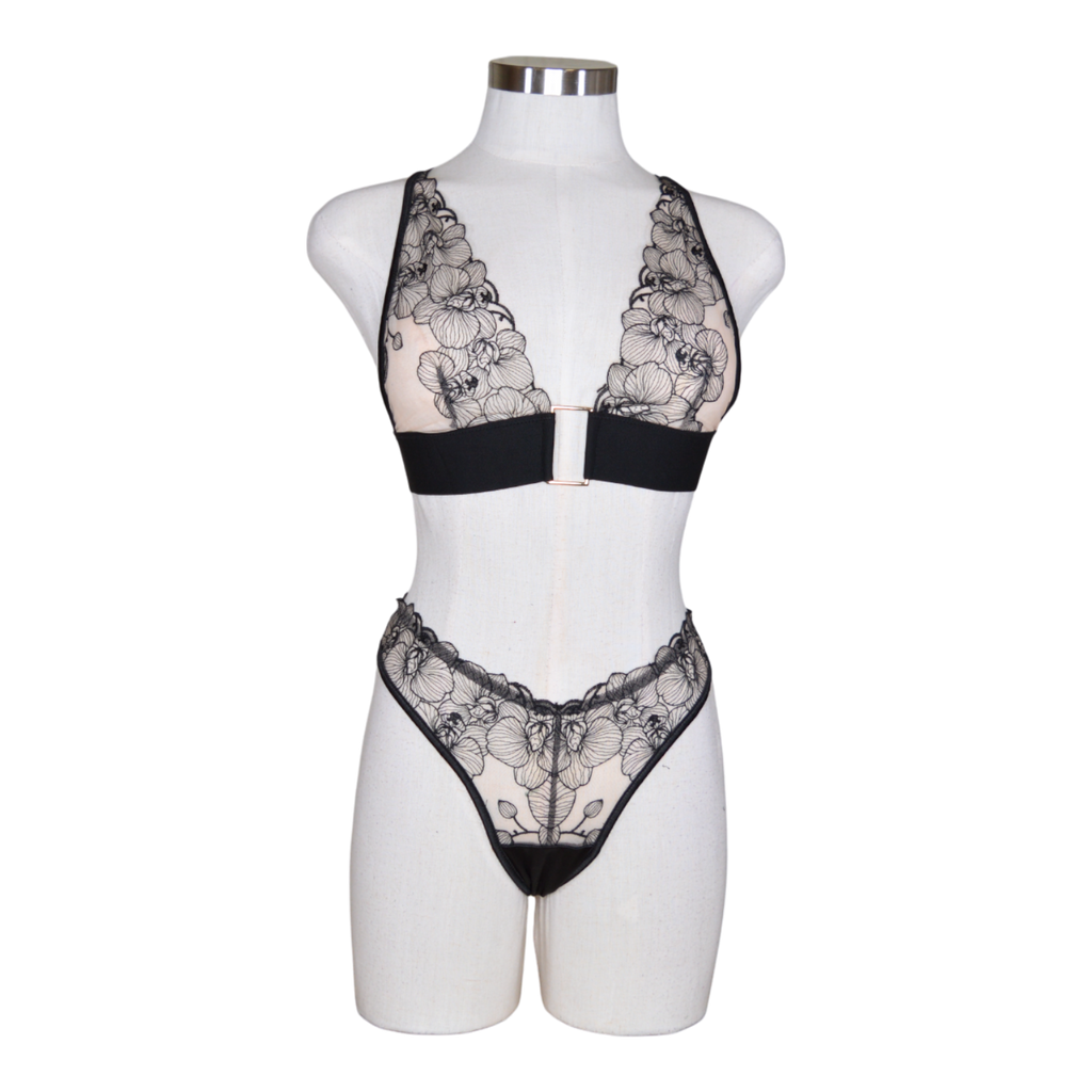 Orchid Blossom 2-Piece Set. Embroidered orchid detail on illusion tulle. Plunge bralette cup. Oversized hardware detail. Thong back. Cotton gusset.