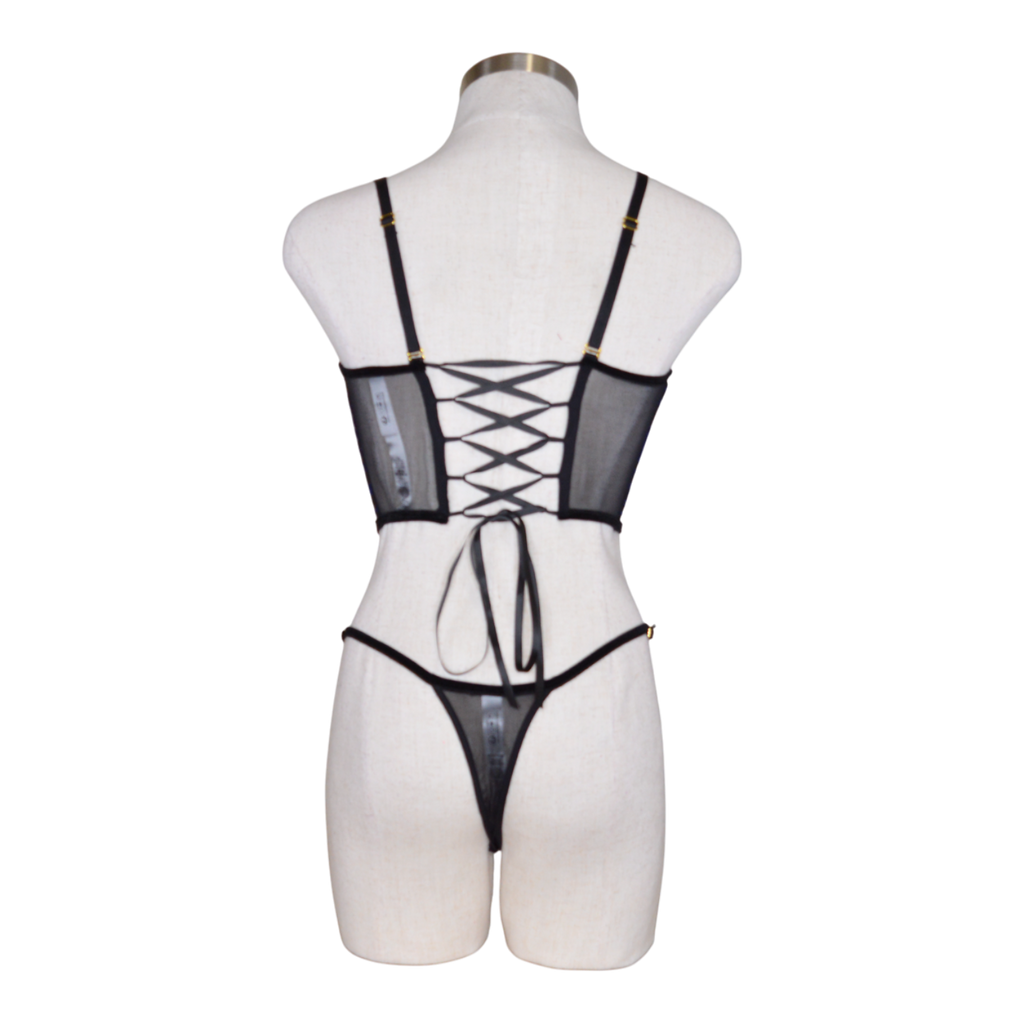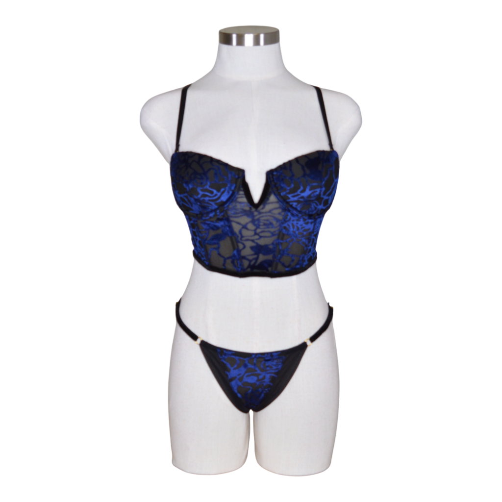 A versatile and luxurious two-piece set in a bold floral velvet pattern. Features an underwire bustier with removable straps and a sexy lace-up back, paired with a matching adjustable panty for the perfect fit.