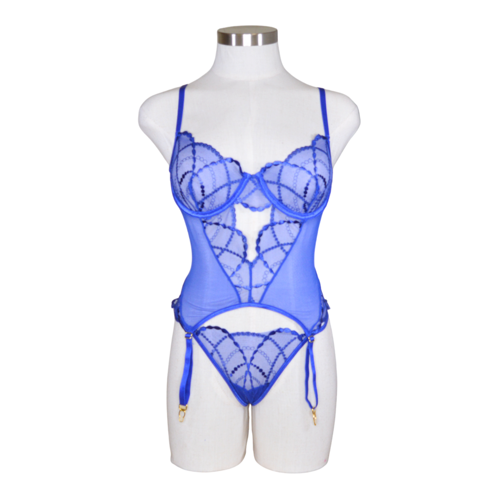 A romantic two-piece set in sapphire blue, combining mesh with soft embroidered accents. Features a bustier with adjustable straps, attached garters, and a fully adjustable lace-up back for a perfect fit, paired with a matching panty.