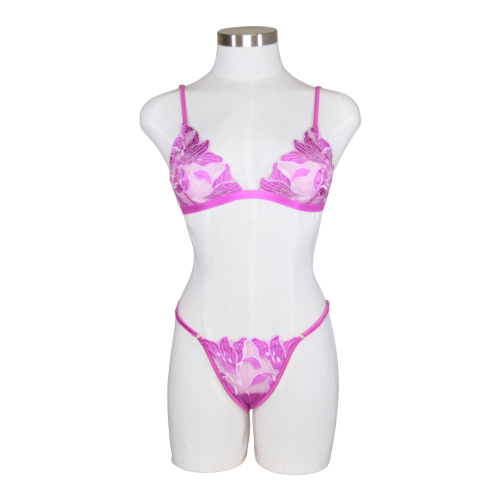 A delicate take on a classic. This two-piece set is reimagined in beautiful, large-scale floral embroidery. Both the top and panty feature adjustable details for a perfect fit. Naked back. Low rise for a modern fit.