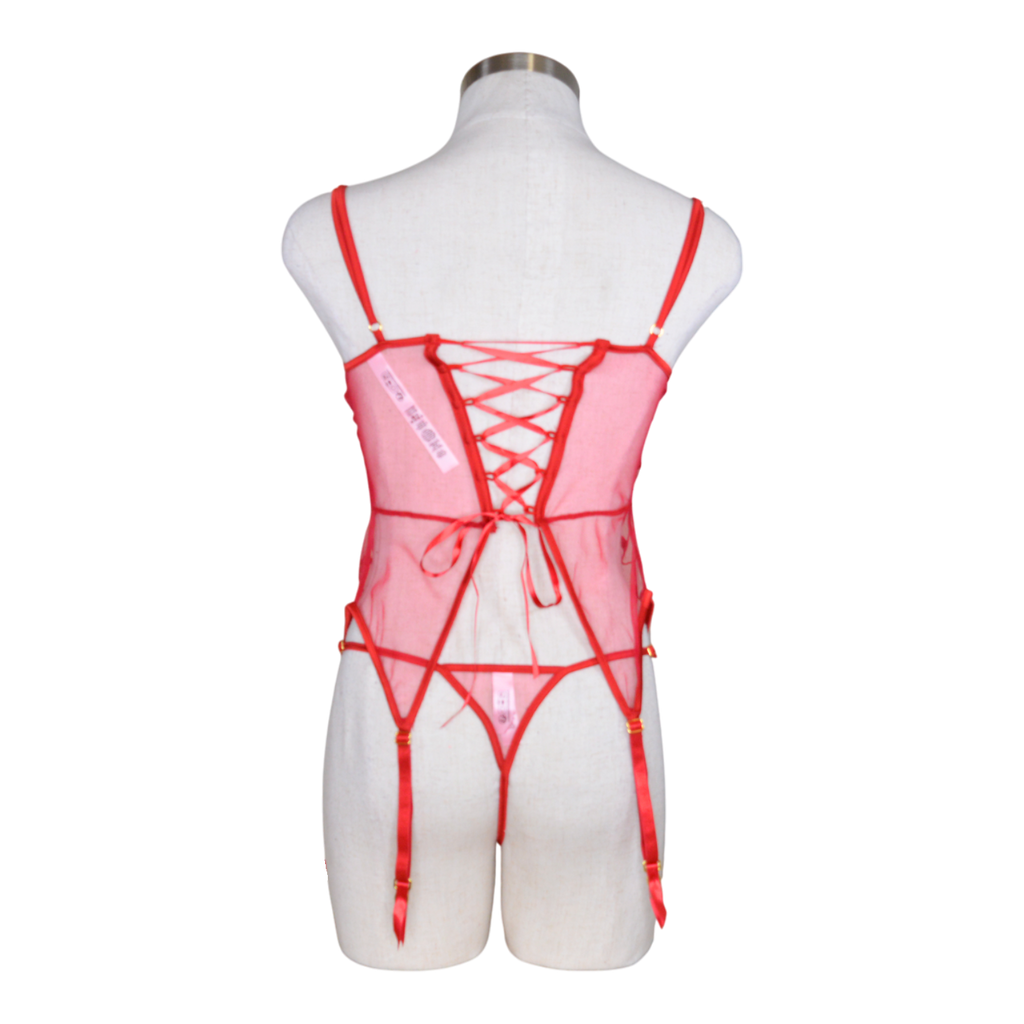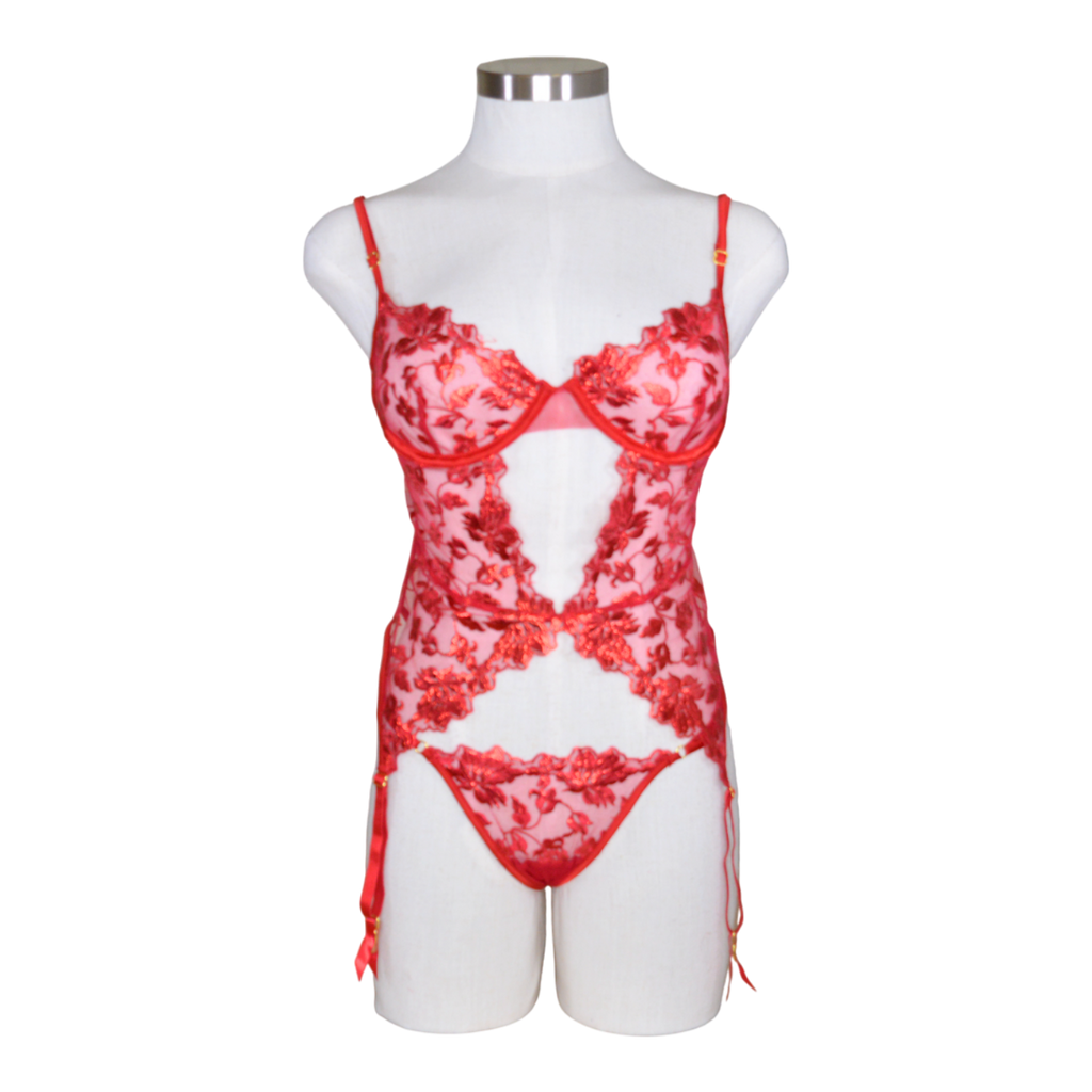 A luxe two-piece featuring monochrome metallic embroidery that casts a gorgeous shine across the fabric. The underwire bustier shapes a flattering silhouette with adjustable straps and a lace-up back for a custom fit. Paired with a matching panty, this set embodies timeless elegance with a festive glow.