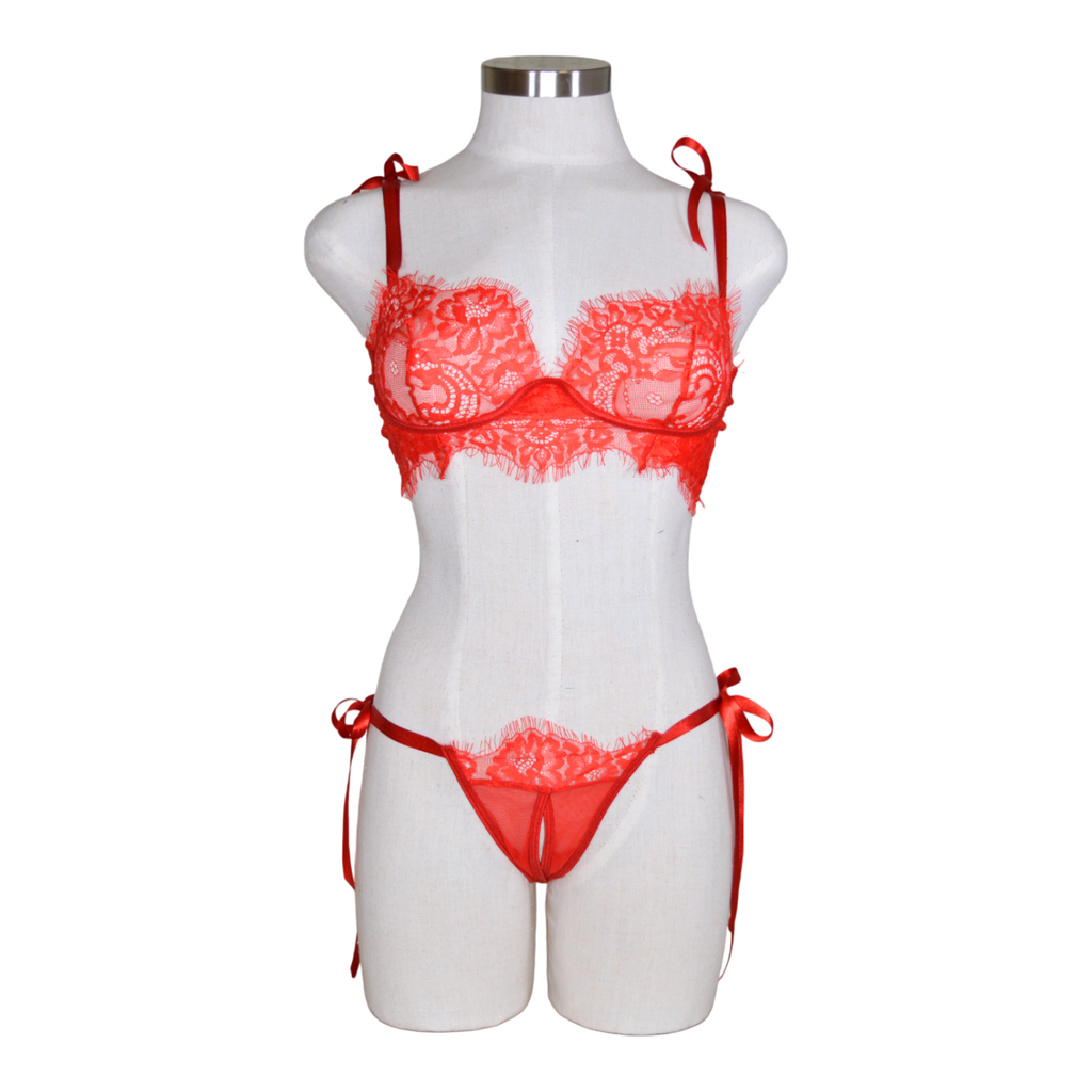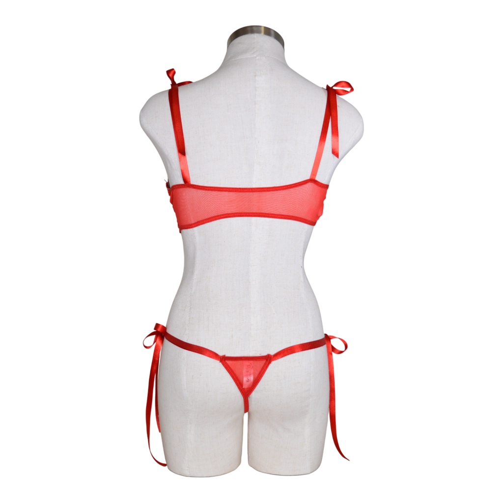 A delicate two-piece lace set with tie straps and a matching side-tie panty, designed to make you feel like the perfect little gift—wrapped in elegance and ready to dazzle. Naked Back. High-cut Thong.