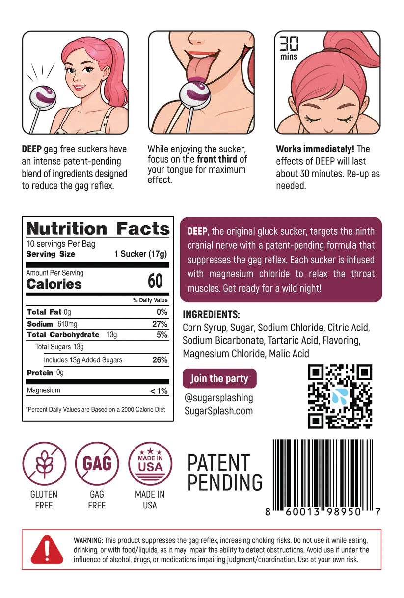 DEEP, the original “gluck sucker”, targets the ninth cranial nerve with a patent-pending formula that suppresses the gag reflex. Each sucker is also infused with magnesium chloride to relax the throat muscles. DEEP suckers work immediately! The effects will last about 30 minutes. Re-up as needed. Tangy, salty and sweet!